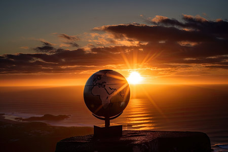 sunrise over globe, with the sun peeking out from behind the horizon and casting a warm glow on the scene, created with generative ai