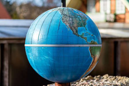 A old world globe is standing on the street.Outdoor image.