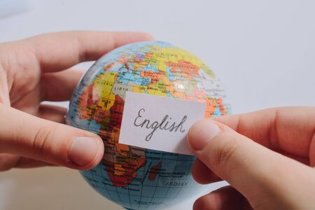 Hand holding notepaper with English wording on model globe