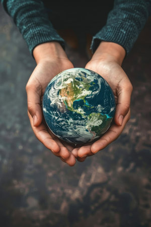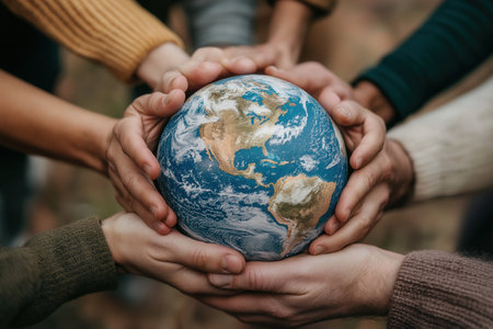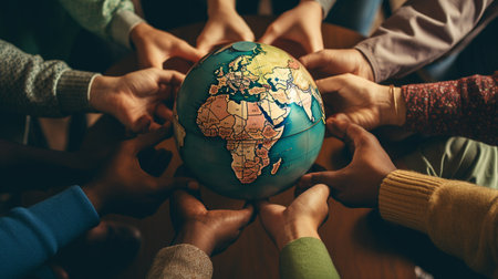 Hands from different cultures and ethnicities jointly holding the Earth, promoting diversity and unity