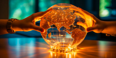 A human hand gently cradles a transparent, glowing blue globe, showcasing illuminated digital continents and intricate network lines across its surface.