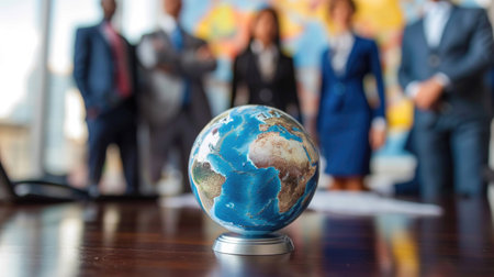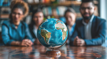 A team of strategists gathers around an illuminated crystal globe, pointing to key regions as they map out their international business expansion.