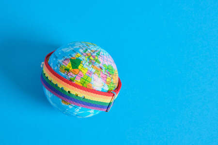 The toy planet Earth and bracelet in the colors of the lgbt community, freedom of choice, freedom of love and marriage concept, pride concept