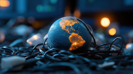 A small globe lies on a blue background, surrounded by wires.