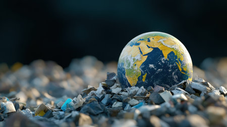 Globe encircled by piles of single-use trash, representing throwaway culture and environmental decay