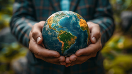 Two hands hold gently a detailed depiction of Earth, showing its blue oceans and green continents. Generative AI