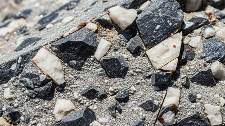 Macro shot of a dark rocky surface highlighting sharp textures and scattered mineral deposits, showing natural geological details.