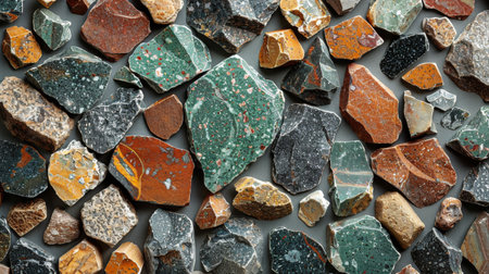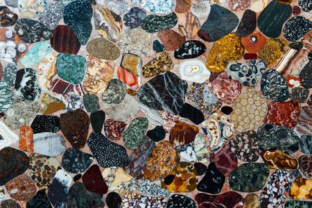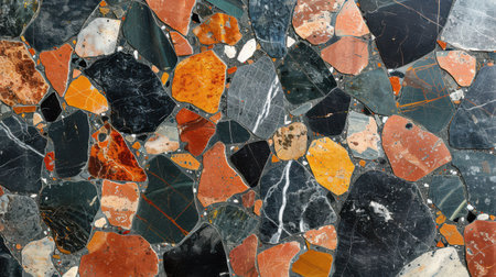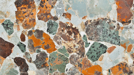 An abstract representation of a colorful mosaic stone surface showcasing a blend of earthy tones and unique patterns, perfect for design projects or backgrounds.