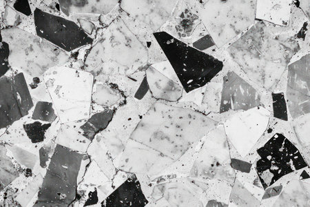 Elegant black, gray, and white terrazzo pattern with scattered stone fragments embedded in seamless polished surface