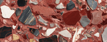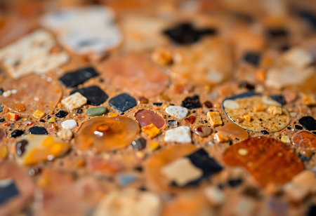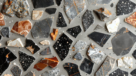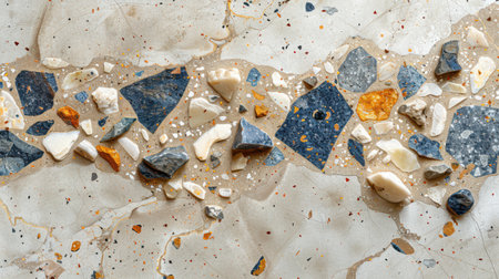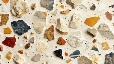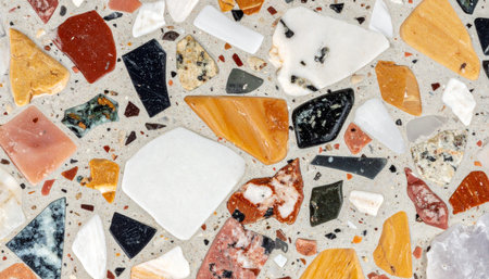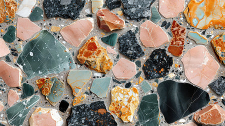 A macro view reveals an array of colorful chips in a stylish terrazzo design. The vibrant fragments unite in a harmonious blend, perfect for modern decor, creating an artistic focal point.