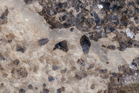 Minerals showing close up of a rough gray rock with embedded black and white mineral fragments keywords:...