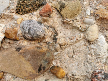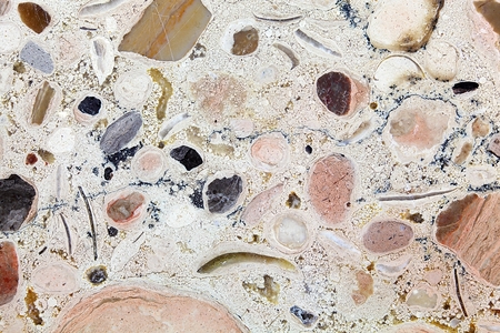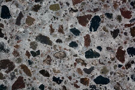 Texture of concrete with multicolored pebbles on the surface. Monolithic concrete wall or garden path with inclusion of multicolored pebbles, high resolution.