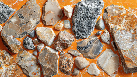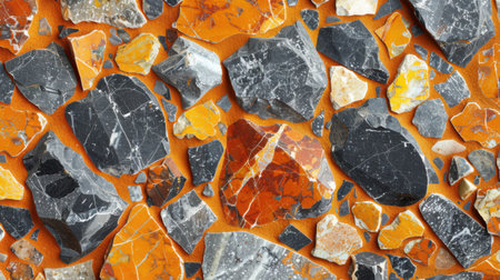Beautiful collection of colorful stones featuring shades of blue, orange, and white, arranged in visually appealing pattern. unique textures and colors create artistic and natural aesthetic