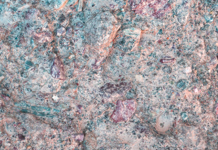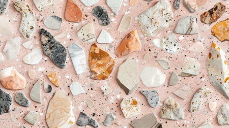 Abstract terrazzo background with light pink cement base and scattered mineral fragments in natural colors