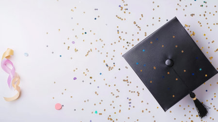 Elegant aesthetic invitation mockup for graduation with academic cap. Light background with confetti. Generative AI.