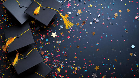 Celebratory graduation scene black cap on white books with colorful confetti background