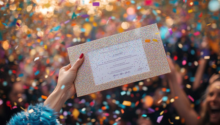 A woman is standing in front of a lively crowd while holding an envelope, surrounded by colorful confetti falling down