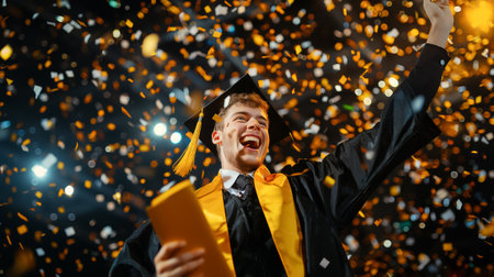 Joyful graduate celebrates their achievements with colorful confetti, sharing pride and happiness with family and friends during this special moment.