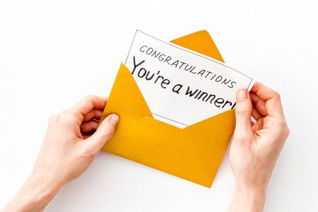 Congratulations Youre a winner. Hands holding envelope with letter. White background top view