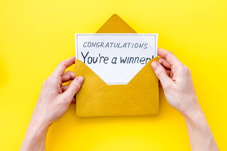 Congratulations You're a winner. Hands holding envelope with letter. Yellow background top view.