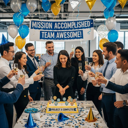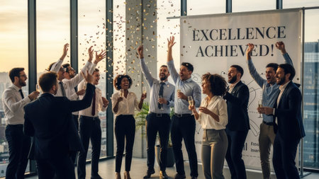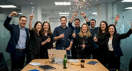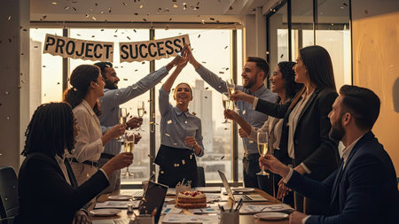 A diverse group of professionals celebrate project success, raising glasses in a toast. The indoor scene features natural lighting and a celebratory atmosphere, complemented by confetti and a banner. The image is suitable for use in business publications and marketing materials.