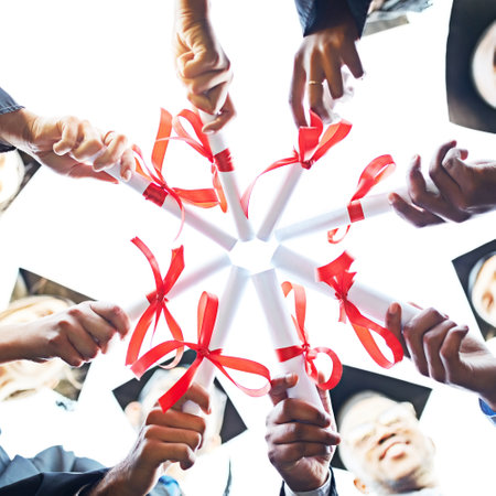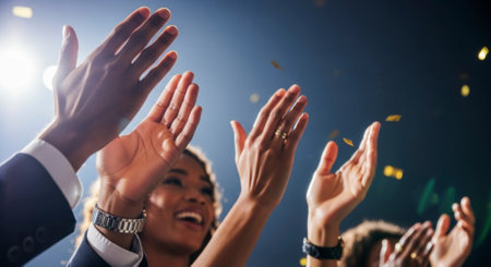 Diverse hands enthusiastically clapping and celebrating at a festive event, illuminated by bright stage lights with falling confetti. Symbolizes success, recognition, and achievement.
