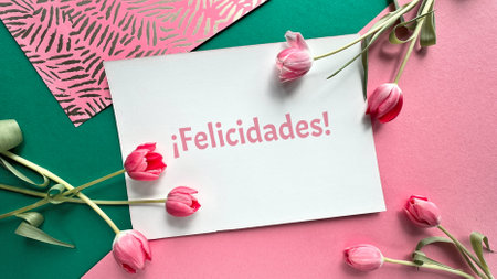 Greeting card featuring the Spanish text Felicidades meaning Congratulations in English, surrounded by pink tulips on a vibrant green and pink background.