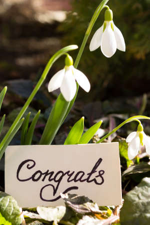 Greeting card with the inscription Congrats on the background of blooming snowdrops on a blurred background