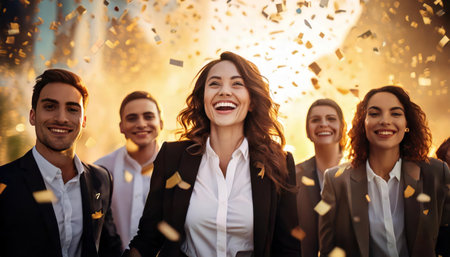 Group of business people celebrating success together with confetti in the air