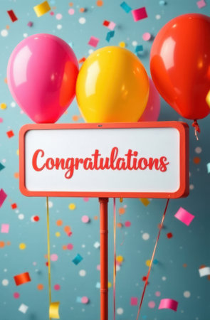 Colorful balloons floating over a congratulations sign with falling confetti on a turquoise background create a festive celebration image