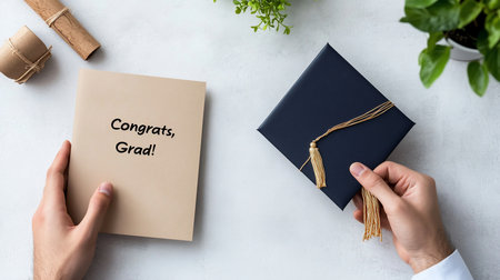 A top-down view of hands holding a black graduation cap with a gold tassel and a brown card with 'Congrats Grad' written on it, symbolizing a significant educational milestone.