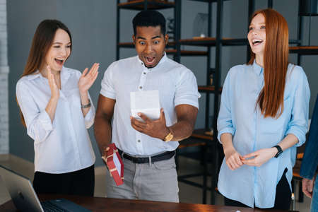 Cheerful diverse team of employees from start-up firm celebrating birthday to colleague. Cheerful multi-ethnic business group congratulate excited boss during party in office.