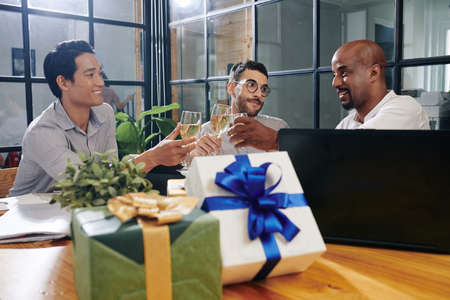 Multiethnic group of business people celebrating success at office party.