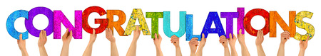 hands holding up colorful wooden letters shaping the word congratulations isolated on white background