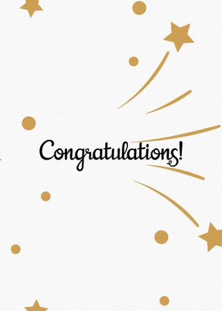 A festive congratulations card design featuring the word Congratulations in a stylish cursive font Gold shooting stars with radiating lines create a celebratory atmosphere around the word Scattered gold confetti dots enhance the festive feel The background is a clean bright white providing a crisp and elegant look This design is perfect for cards invitations announcements and other celebratory materials conveying joy achievement and success It is versatile and suitable for a variety of occasions from graduations to new jobs and other important milestones