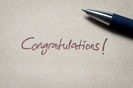 A close-up of a handwritten Congratulations written in ink on paper, symbolizing celebration, achievement, and positive acknowledgment.