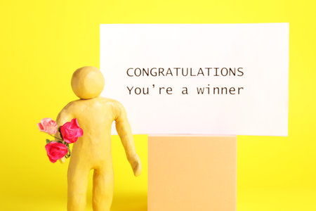 Human figure holding bouquet of flowers and card with phrase Congratulations You`re Winner against yellow background