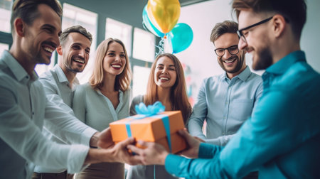 In an office setting, a group of colleagues celebrate a birthday. One man receives a cake from two others, while the rest observe. The scene is brightly lit, featuring balloons and decorations. The event likely depicts a business celebration, suitable for various editorial and promotional uses.