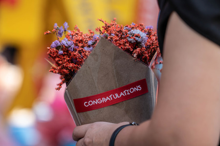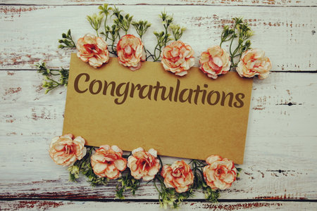 Congratulations text write on paper card with flowers decoration on wooden background