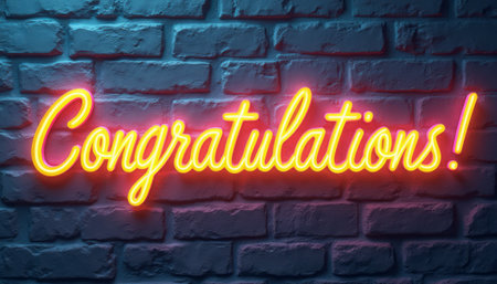 This eye-catching image features a glowing neon sign that reads Congratulations in a playful cursive font, set against a rustic brick wall. The bright colors and warm glow create a celebratory atmosphere, perfect for marking special achievements and joyful moments.