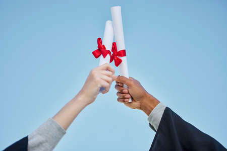 Theres no limit what we can achieve. Closeup shot of two unrecognisable graduates celebrating with their diplomas on graduation day.
