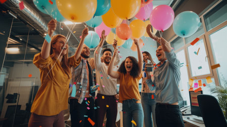 A lively group of people celebrating joyously, holding colorful balloons and throwing confetti in the air.