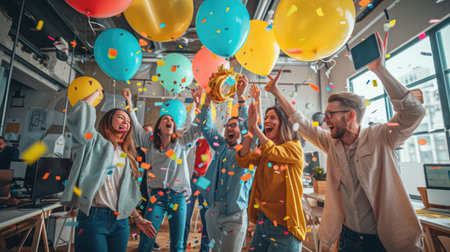 A group of professionals celebrates an achievement in a modern office. Confetti falls as individuals raise their arms, lit by natural daylight. The image showcases a banner with text and the collaborative spirit of the team. Suitable for use in business and editorial content, this image highlights accomplishment.