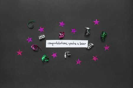 Paper with text CONGRATULATIONS YOU'RE A LOSER, stars and serpentine on dark background
