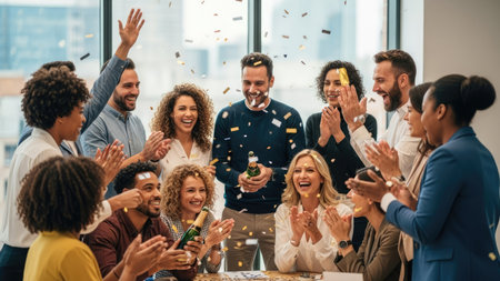Diverse group of people celebrating with champagne and confetti