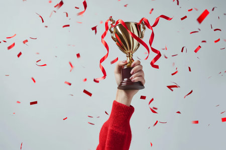 Hand holding a gold trophy cup aloft, amidst a shower of colorful confetti and streamers, symbolizing celebration and success.