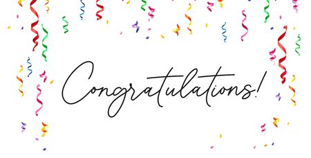 Congratulations festive banner on white background vector illustration. Congrats on birthday anniversary new year party with colorful confetti and serpentine. Greeting and celebration concept