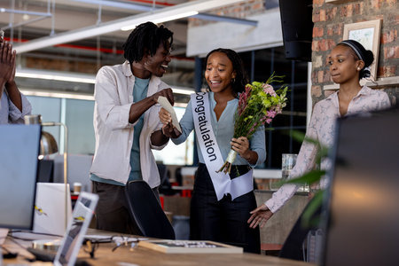 Colleagues celebrating with flowers and banner in modern office, feeling joyful. Teamwork, collaboration, celebration, business, office culture, success
