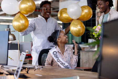 Congratulating woman with balloons and flowers, colleagues celebrating success at office. Celebration, achievement, teamwork, workplace, recognition, joy
