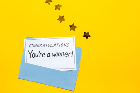 You are a winner. Golden envelope with congratulation card. Top view